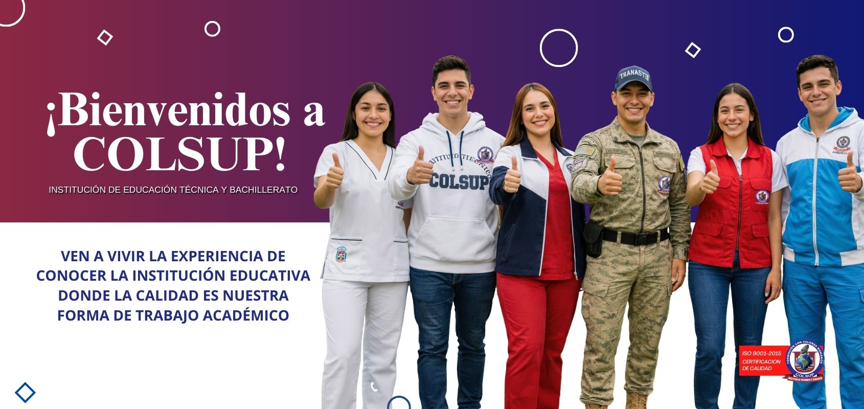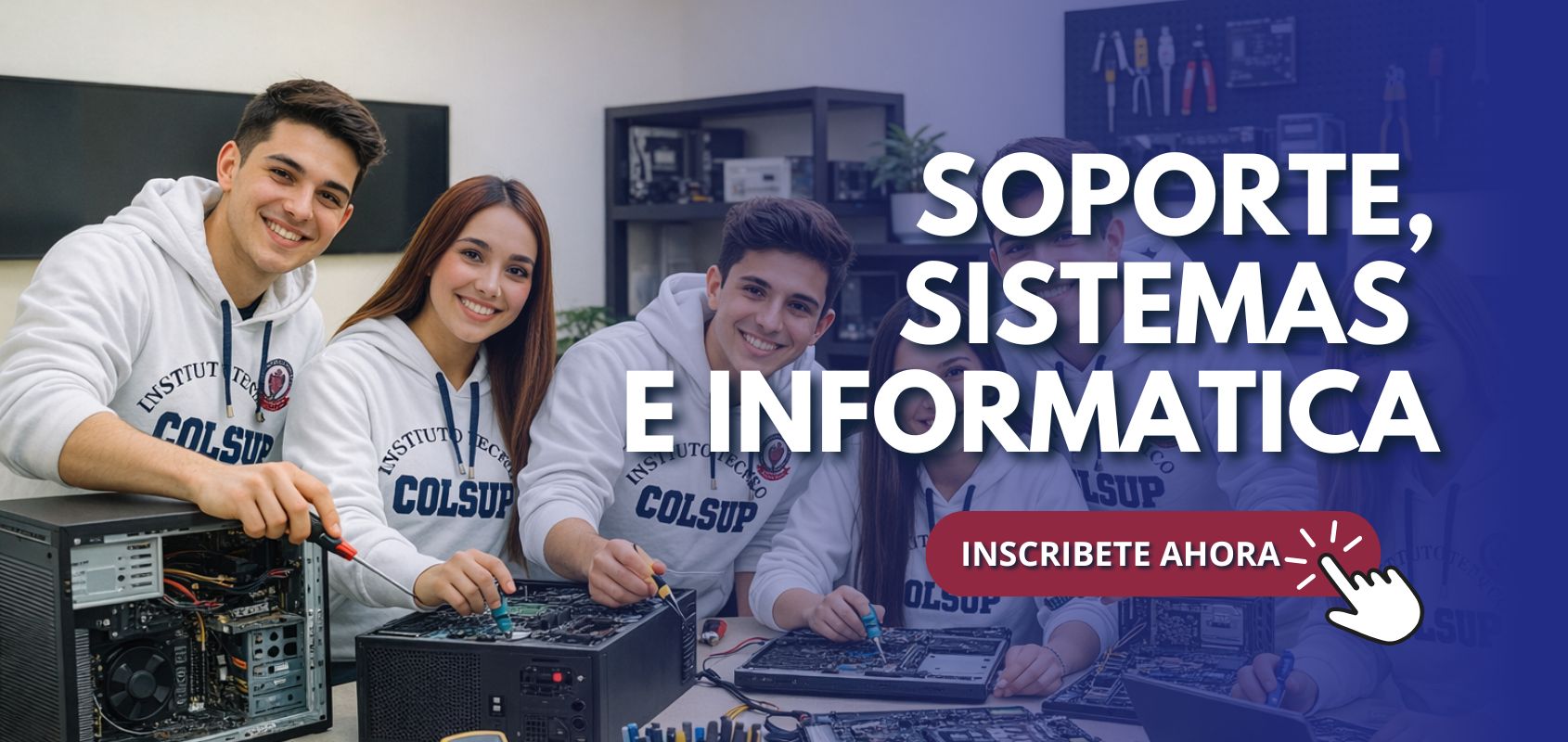 ¡Bienvenido a COLSUP! Somos tu puerta hacia una formación técnica de calidad. Ofrecemos programas especializados en áreas de alta demanda, con titulación ágil, opciones presenciales, y convenios estratégicos con empresas y entidades educativas. Nuestro objetivo es formar Técnicos Laborales para enfrentar los retos del mundo actual y contribuir activamente al desarrollo del sector productivo del país.
